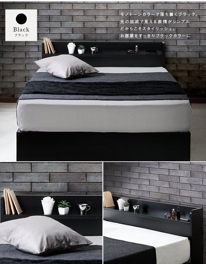 シンプルに見えても機能は豊富! ヘッドボードに棚があり、スマホやメガネ、目覚まし時計などのいつも使い小物を手元に置けます。